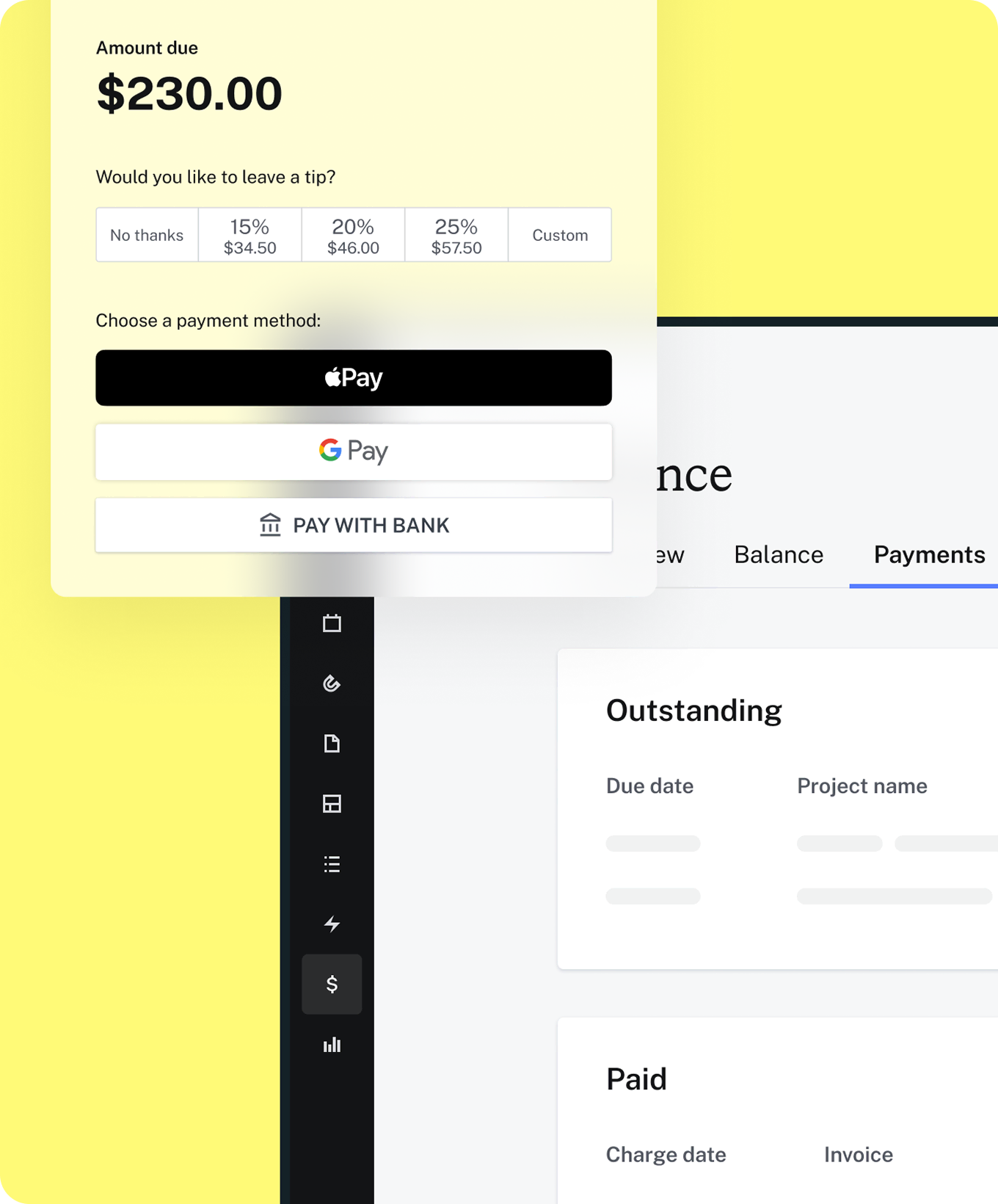 Let clients pay by credit/debit card, bank transfer, Apple Pay, Google Pay, and more.