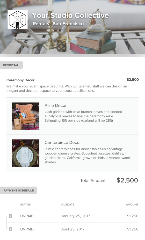 With HoneyBook, you can offer your clients the ultimate experience to view your beautiful proposals, sign & pay effortlessly without ever having to print or mail a thing. All client documents are stored in one place so you can access files and notes no matter where you are - on your laptop or smartphone. Offer your clients the ultimate experience to view your beautiful proposals, sign & pay effortlessly without ever having to print or mail a thing.
