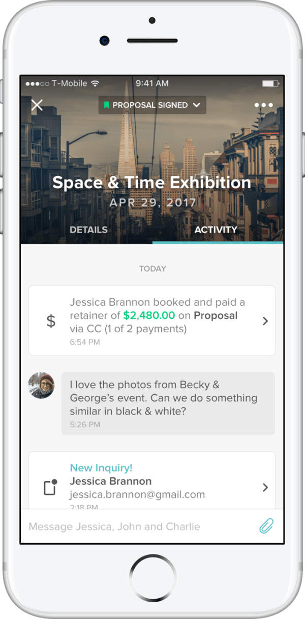 HoneyBook’s mobile app ensures you can stay organized and continue running your business from anywhere. Access client details and files easily from meetings or events. Get new inquiry notifications and quickly respond with templates and files, even while away from your office.