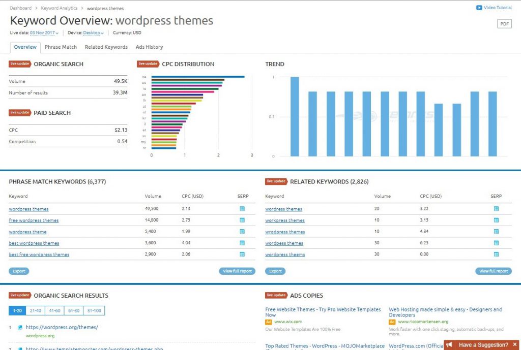 In the screenshot above, you can see the overview of the keyword “WordPress themes” and useful information to inform your keyword strategy. SEMRush gives you trending data in various subsections, including Organic Search, Paid Search, CPC Distribution, Trends, Phrase Match Keywords, Related Keywords, Organic Search Results, and Ads Copies.