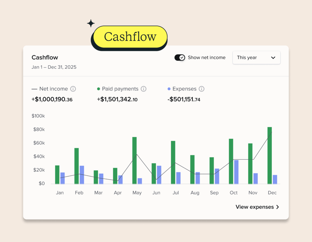 Your financial overview just got a major upgrade. The new Cashflow view brings your payments and expenses together in one place, giving you a clear snapshot of your net income over time. It updates automatically, so you can track performance and make informed financial decisions. Think of it as your business’s financial pulse—always current, always clear.