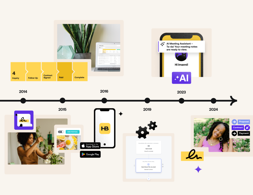 At HoneyBook, we’ve spent the last 12 years deeply immersed in the world of independent businesses. What has guided us from the very beginning is the belief that your success is our success. From humble beginnings as an invoicing tool, we’ve grown alongside our community, continuously evolving to meet your needs.
