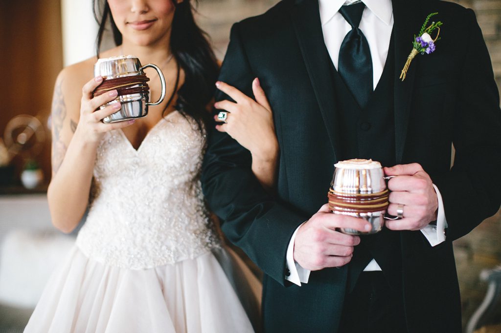 Texture Home, a lovely local boutique consignment shop, brought in neutral furniture, glassware and industrial styled and eclectic decor to accentuate the look of the overall shoot. The food was prepared by LA Gourmet, who are some of the most creative and talented chefs in central Illinois. The cake was brilliantly decorated by Cake Artist studio and the use of florals and metallic+matte tones on the fondant fit the theme to perfection as well!