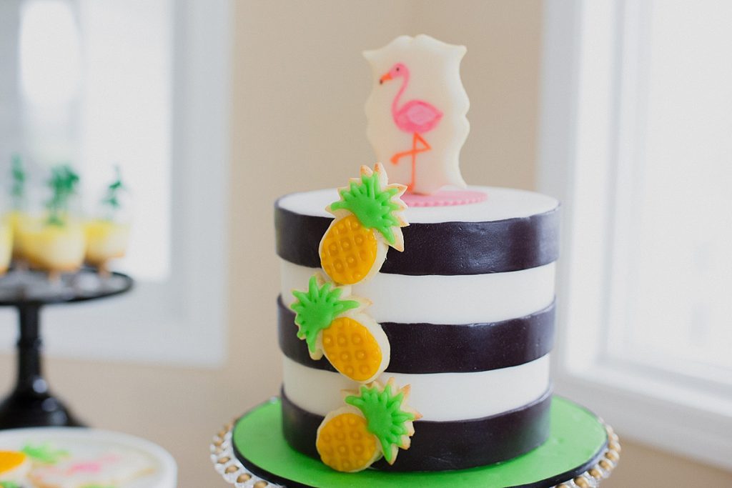 All of the apparel in the shoot came from designers who make children’s clothes: Mini Street Kidswear, House of Posie, and From Harper (plus our resident vinyl vixen, Carla Ferreira of She Cuts Vinyl, custom made some decaled pineapple tees just for this shoot). Each designer either selected or custom created clothes to suit the theme and colour scheme: Kendra Allen from House of Posie illustrated and hand carved a pineapple stamp that she applied onto her own pastel tees (using non-toxic ink) as well as onto a collaboration with Zoe McRorie of From Harper: a custom green romper with a black and white striped back. Milan Wilkinson of Mini Street Kidswear provided black and white striped shorts and a skirt, as well as colourful, printed shorts with suspenders. In addition to the green pineapple rompers the babies modeled, From Harper also showcased a yellow tee with green sleeves and a pair of white and black striped shorts as well as a green and yellow little girls’ romper. She Cuts Vinyl created a white tee with a green pineapple, a white tee with a black pineapple, and a black tee peppered with gold pineapples. She Cuts Vinyl also used the same pineapple design from her shirts to create the gold, sparkly, pineapples used in the garland, in the picture frames, and in the dessert cups as well as the “Party Like a Pineapple” decals on the clear plastic cups. For the mom models, Missy Ross of String for Pearls supplied a handful of her gorgeous teething jewellery designs from a yellow themed version of her A Lesson in Geometry necklace to a black and white Mommy Mala – all created with non-toxic, food grade silicone and wood finished with coconut oil and beeswax.