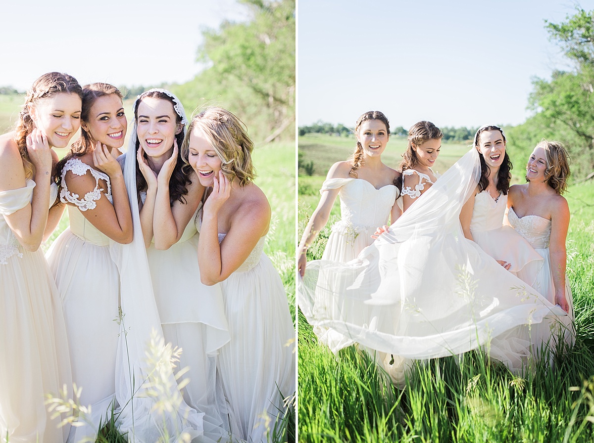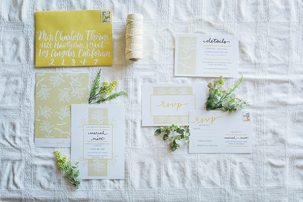 Soaring Wings Vineyard was the perfect place to set the scene for our “Good Life” shoot. The wind was blowing profusely as we setup our whimsical signage, paper goods, and tablescape, and as our bridal muses got dressed in their ethereal gowns and had their hair and makeup done so naturally and elegantly. The sun was shining and there wasn’t a cloud in the sky as our brides walked through the vineyards and our photographers and videographer captured the candid moments between these friends. Our full and lush florals captured a Nebraska summer day and signified our state flower, the goldenrod.
